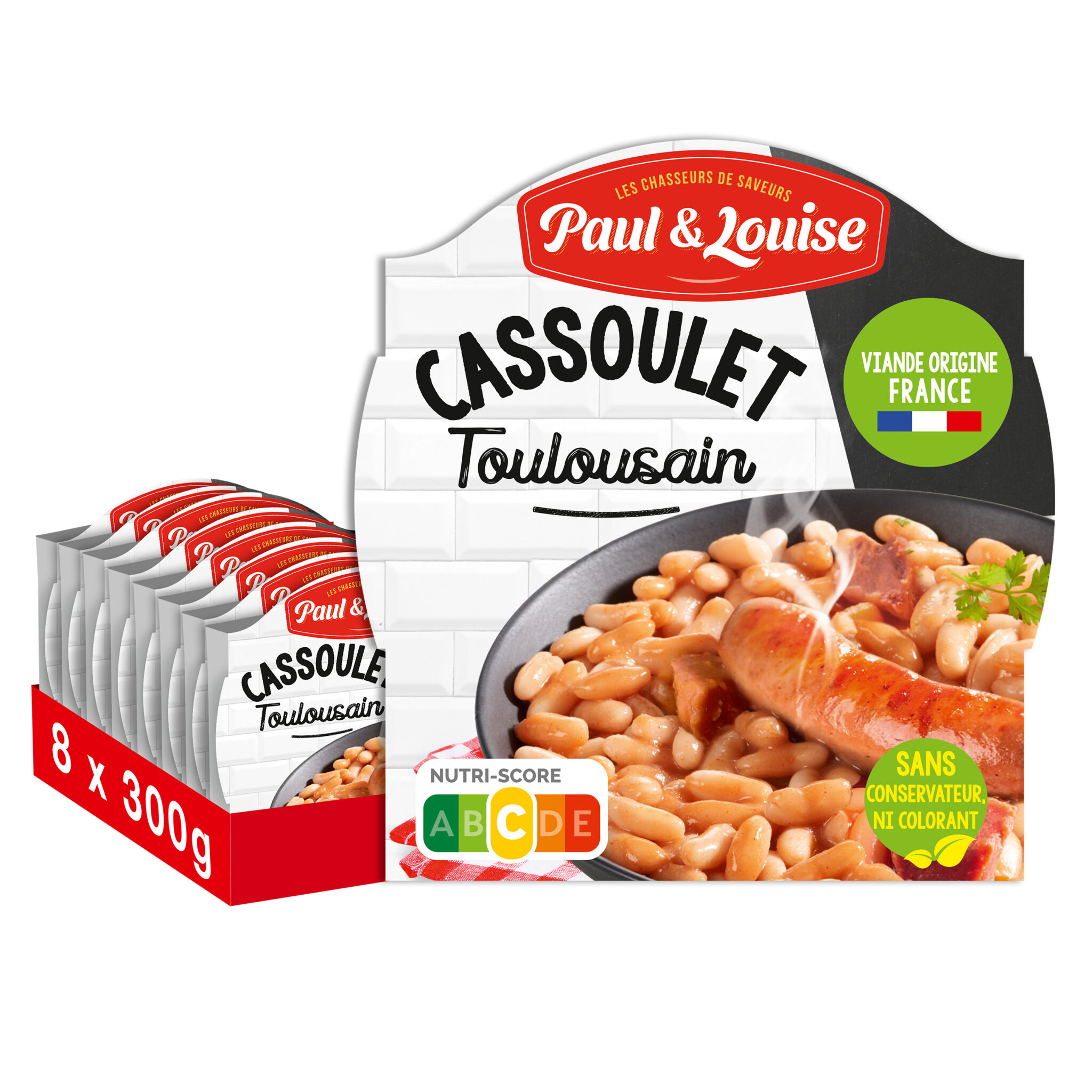 Eau, haricots blancs réhydratés 31%, saucisse de Toulouse précuite 15% (viande de porc (Origine France), eau, sel, poivre), viande de porc traitée en salaison 15% (viande de porc (Origine France), eau, stabilisant,: triphosphates, sel, fibre de BLE), graisse de poulet, concentré de tomates, amidon modifié, plantes aromatiques, sel , arôme naturel.
